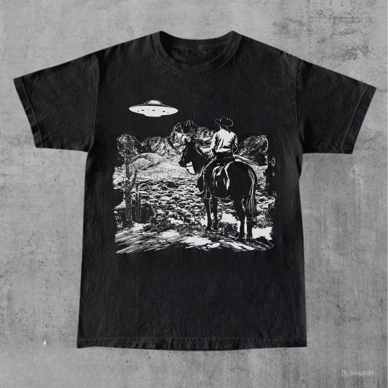 Ufo Western Shirt, Retro T-Shirt, Vintage Cowboy TShirt, Rodeo T Shirt, Wild West Shirt, Western Tee, Unisex, Full Sizes, Full Colors, Cotton Round Neck Tee, Unisex T-shirt for Men and Women Menswear Top